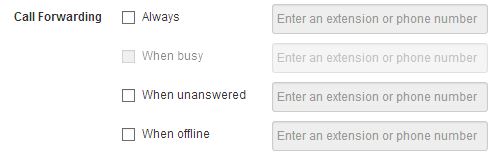 In the above section, each of these options specifies if and how a call is forwarded. Enabling "Always" will send every incoming call to whatever you specify, and will forego your extension entirely. "When unanswered" will forward any calls that you don't answer. "Busy" and "offline" function as you'd expect - it handles forwards when your phone is in that state.